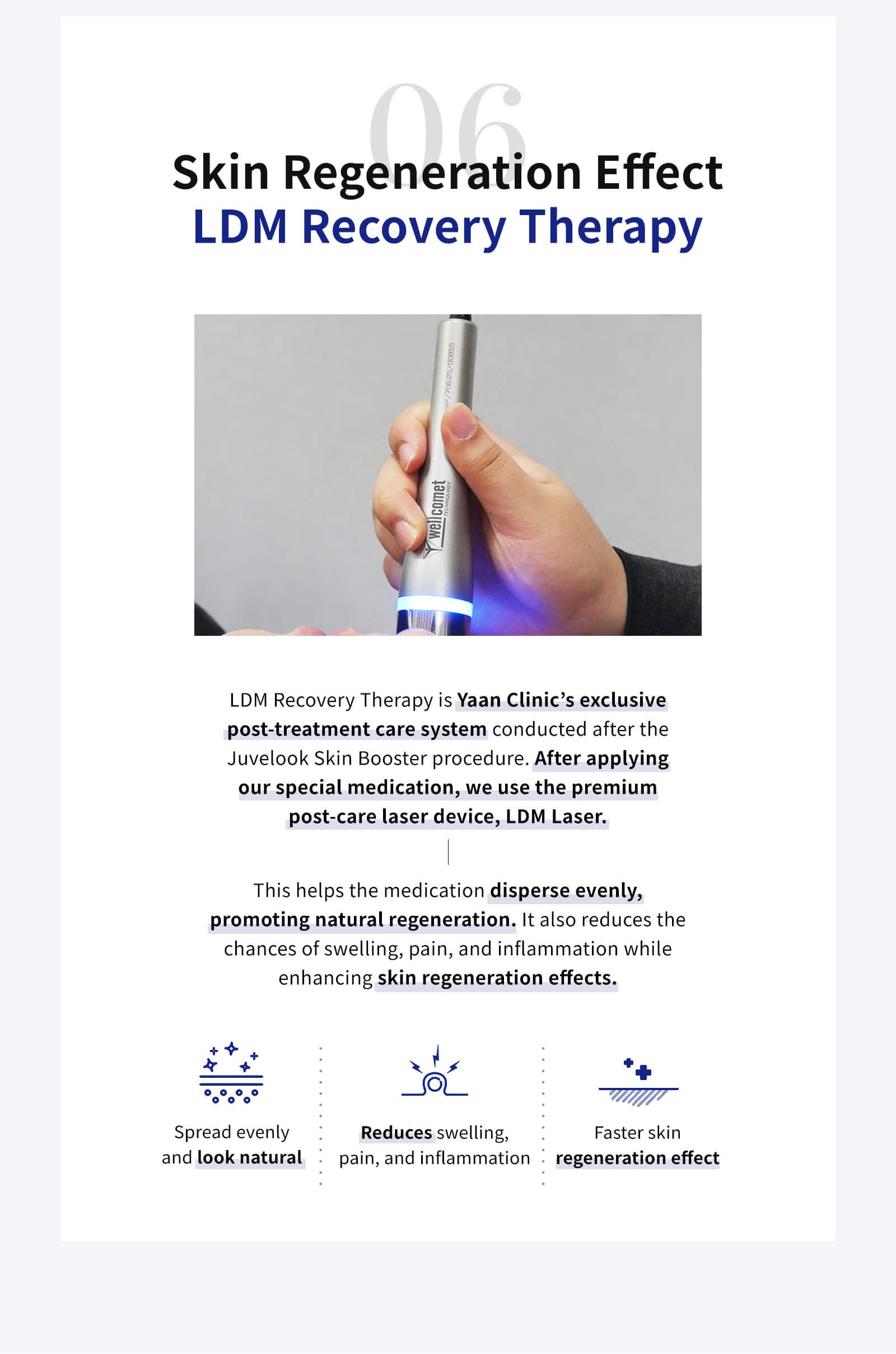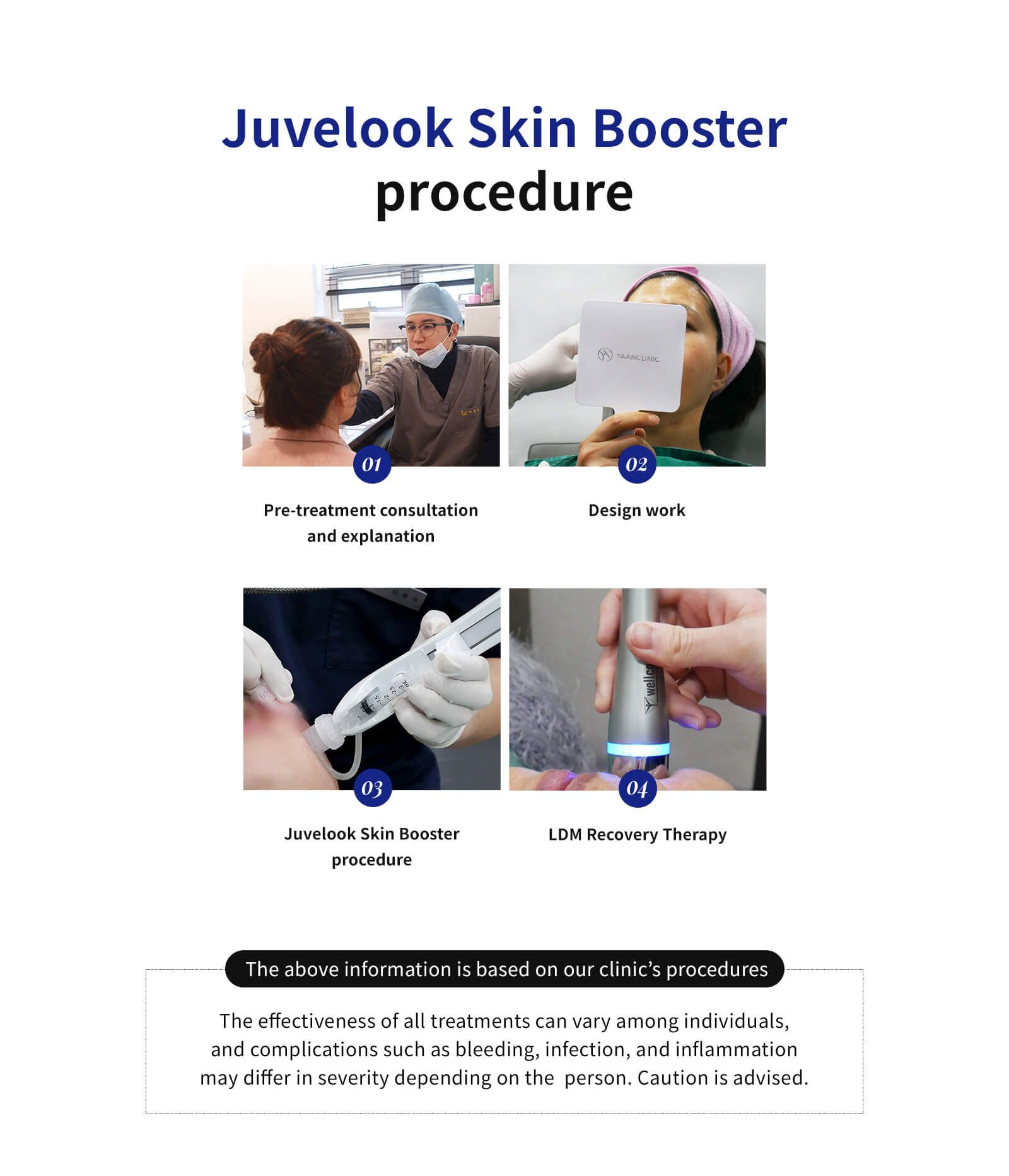 - Juvelook injected into targeted layers (deep dermis/sub-dermal) in specific zones (face, under‐eyes, cheeks, neck) based on consultation. Lienjang Clinic Korea+1